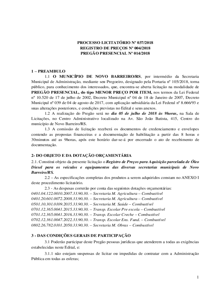 PROCESSO LICITATRIO N 037/2018 REGISTRO DE PREOS N 004/2018 PREGO PRESENCIAL N 014/20181 PREAMBULO 1.1 O MUNICPIO DE NOVO BARREIRO/RS, por intermdio da Secretaria Municipal de Administrao, mediante