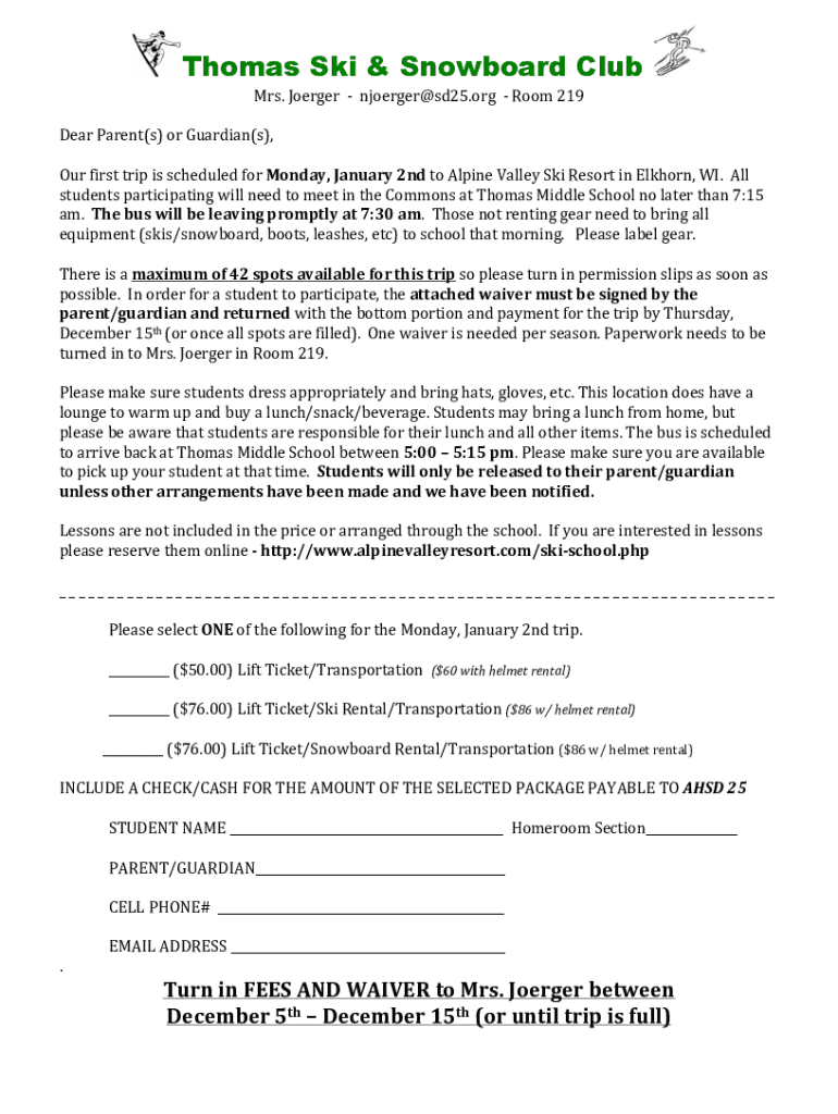Thomas Ski & Snowboard Club Mrs.Joergernjoerger@sd25.orgRoom219 DearParent(s)orGuardian(s), OurfirsttripisscheduledforMonday,January2ndtoAlpineValleySkiResortinElkhorn,WI.All studentsparticipatingwillneedtomeetintheCommonsatThomasMiddleSchoolnolaterthan7:15