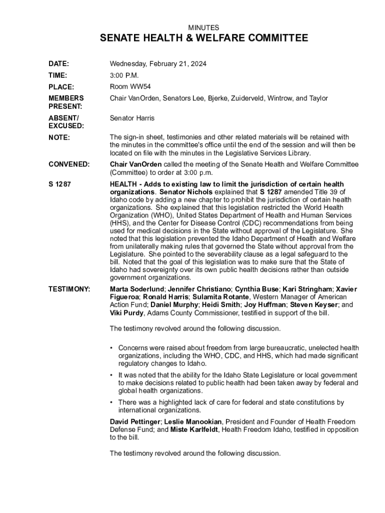 MINUTESSENATE HEALTH & WELFARE COMMITTEE DATE:Wednesday, February 21, 2024TIME:3:00 P.M.PLACE:Room WW54MEMBERS PRESENT:Chair VanOrden, Senators Lee, Bjerke, Zuiderveld, Wintrow, and TaylorABSENT/