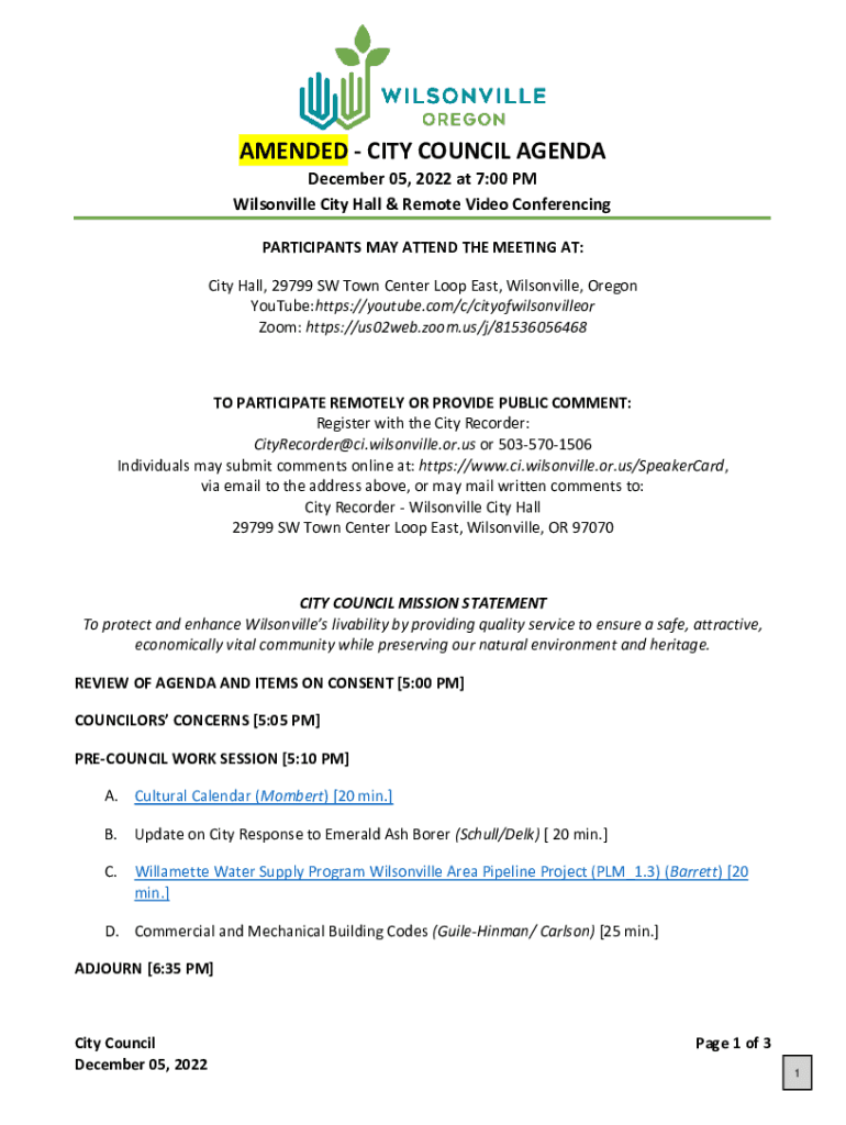 AMENDED CITY COUNCIL AGENDA December 05, 2022 at 7:00 PM Wilsonville City Hall & Remote Video Conferencing PARTICIPANTS MAY ATTEND THE MEETING AT: City Hall, 29799 SW Town Center Loop East, Wilsonville,