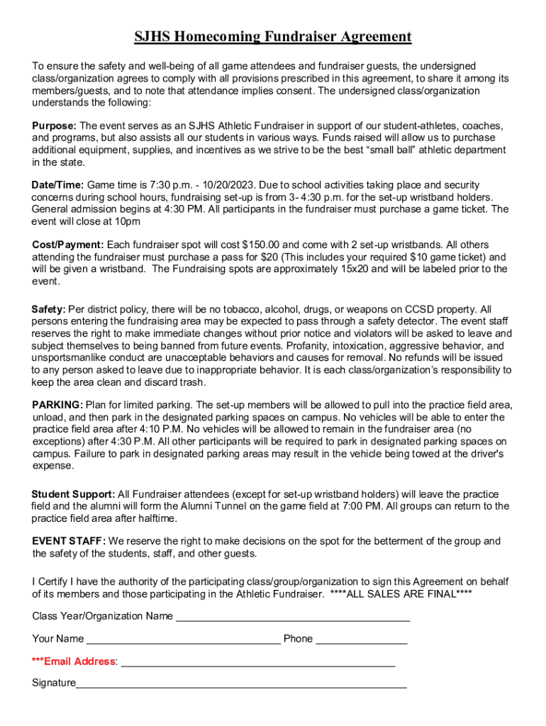 SJHS Homecoming Fundraiser Agreement To ensure the safety and wellbeing of all game attendees and fundraiser guests, the undersigned class/organization agrees to comply with all provisions prescribed