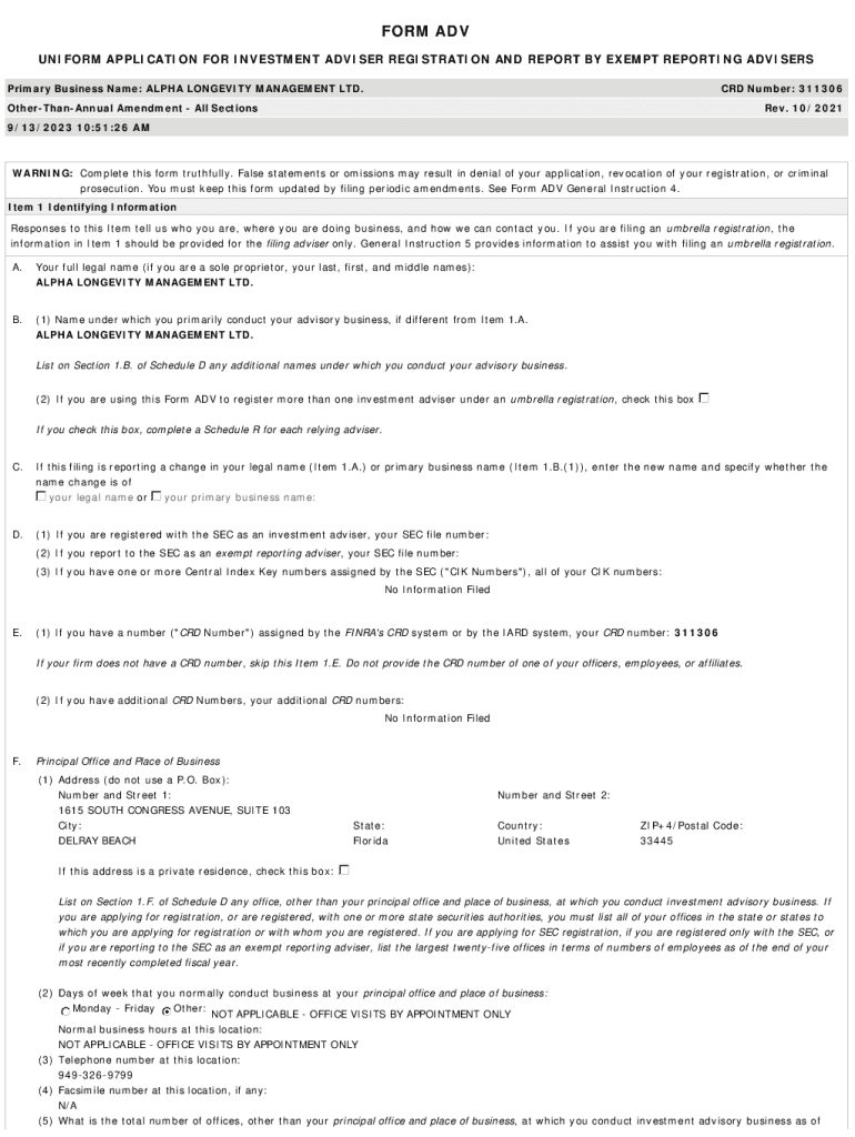 FORM ADV UNIFORM APPLICATION FOR INVESTMENT ADVISER REGISTRATION AND REPORT BY EXEMPT REPORTING ADVISERS Primary Business Name: ALPHA LONGEVITY MANAGEMENT LTD.CRD Number: 311306OtherThanAnnual Amendment
