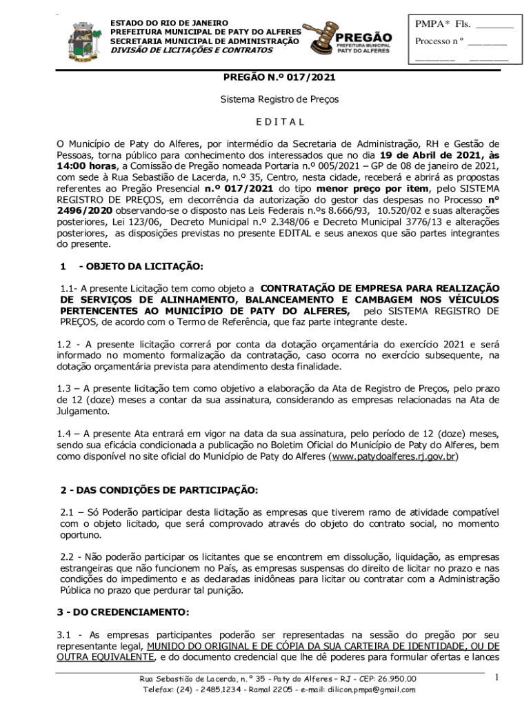 ESTADO DO RIO DE JANEIRO PREFEITURA MUNICIPAL DE PATY DO ALFERES SECRETARIA MUNICIPAL DE ADMINISTRAODIVISO DE LICITAES E CONTRATOSPMPA* Fls. ___ Processo n ___ ______PREGO N. 017/2021 Sistema Registro