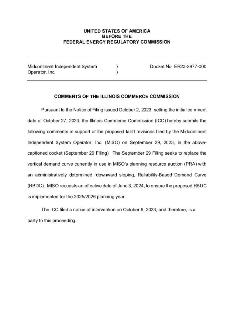 UNITED STATES OF AMERICA BEFORE THE FEDERAL ENERGY REGULATORY COMMISSIONMidcontinent Independent System Operator, Inc.) )Docket No. ER232977000COMMENTS OF THE ILLINOIS COMMERCE COMMISSION Pursuant
