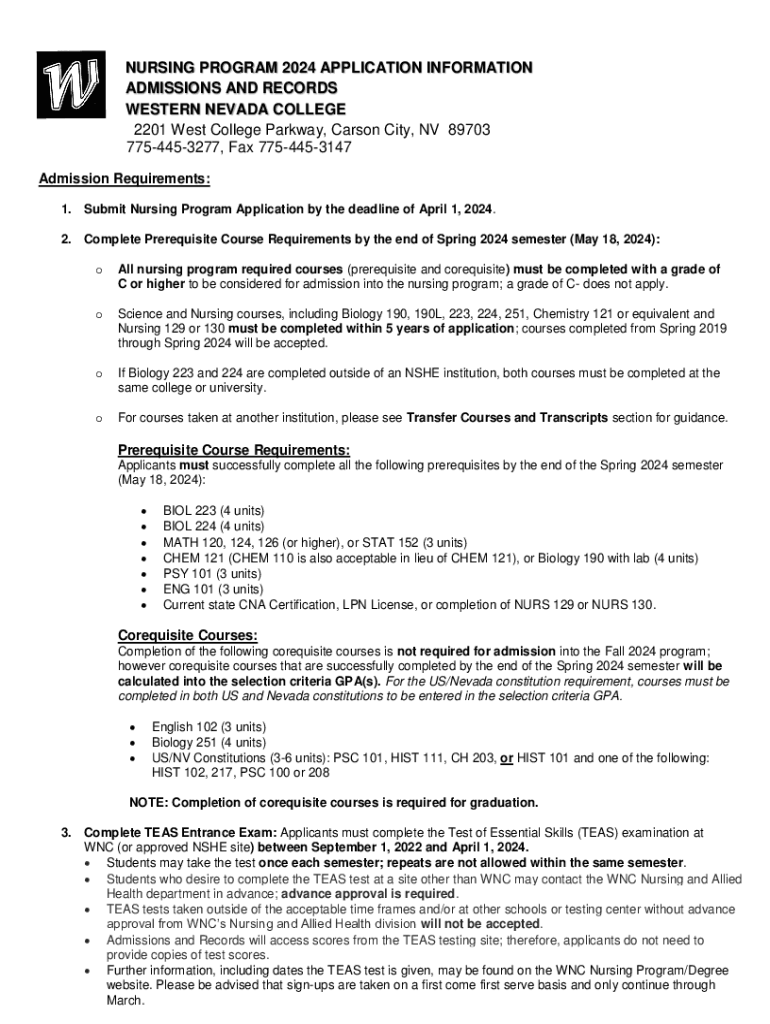 NURSING PROGRAM 2024 APPLICATION INFORMATION ADMISSIONS AND RECORDS WESTERN NEVADA COLLEGE 2201 West College Parkway, Carson City, NV 89703 7754453277, Fax 7754453147 Admission Requirements: 1. Submit