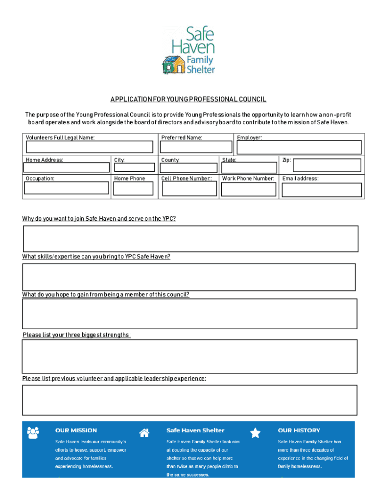 APPLICATION FOR YOUNG PROFESSIONAL COUNCIL The purpose of the Young Professional Council is to provide Young Professionals the opportunity to learn how a nonprofit board operates and work alongside