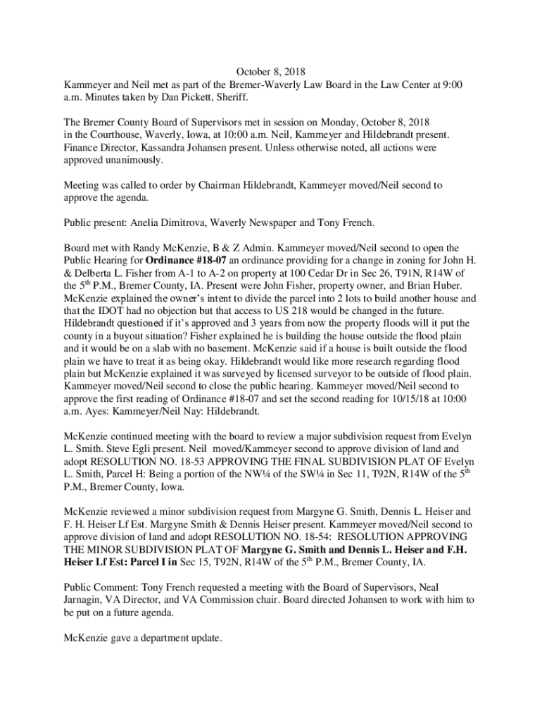 October 8, 2018 Kammeyer and Neil met as part of the BremerWaverly Law Board in the Law Center at 9:00 a.m. Minutes taken by Dan Pickett, Sheriff. The Bremer County Board of Supervisors met in session