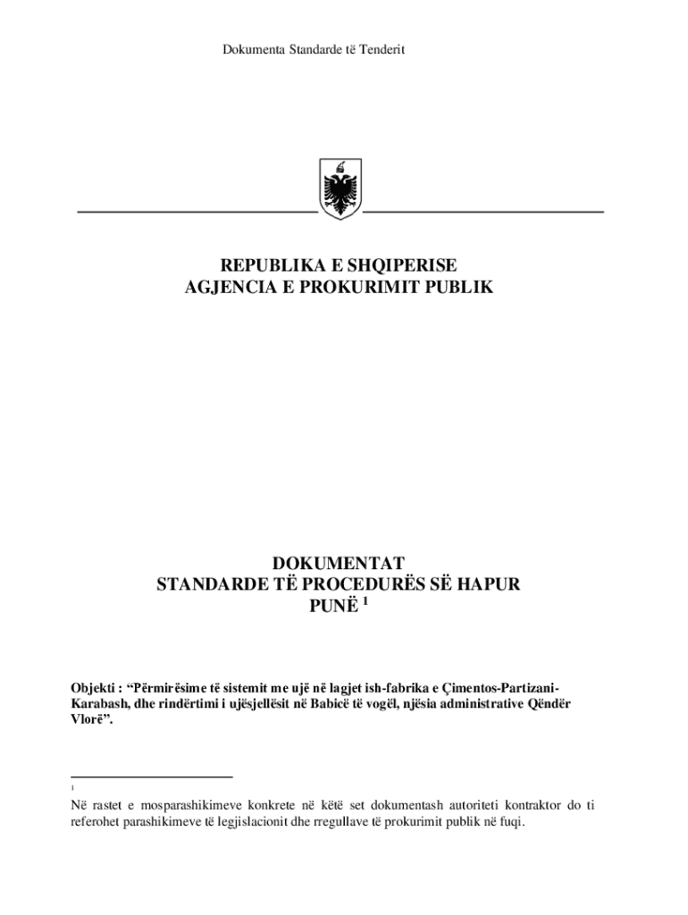 Dokumenta Standarde t TenderitREPUBLIKA E SHQIPERISE AGJENCIA E PROKURIMIT PUBLIKDOKUMENTAT STANDARDE T PROCEDURS S HAPUR PUN 1Objekti : Prmirsime t sistemit me uj n lagjet ishfabrika e imentosPartizaniKarabash,