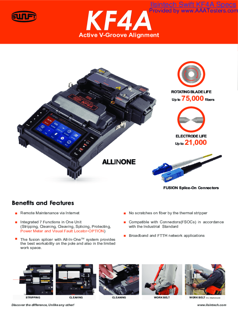 Ilsintech Swift KF4A SpecsProvided by www.AAATesters.comActive VGroove AlignmentROTATING BLADE LIFE Up to75,000 fibersELECTRODE LIFE Up to21,000FUSION SpliceOn ConnectorsBenefits and Features Remote