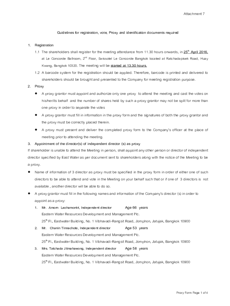 Attachment 7Guidelines for registration, vote, Proxy and identification documents required 1. Registration 1.1 The shareholders shall register for the meeting attendance from 11.30 hours onwards,