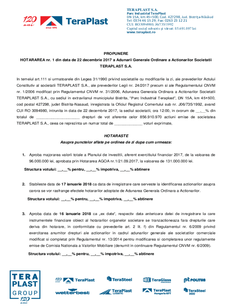 TERAPLAST S.A. Parc Industrial TeraPlast DN 15A, km 45+500, Cod. 427298, Jud. BistriaNsud Tel: 0374 46 15 29; Fax: 0263 23 12 21 CUI: RO3094980; J6/735/1992 Capital social subscris i vrsat: 85.691.097