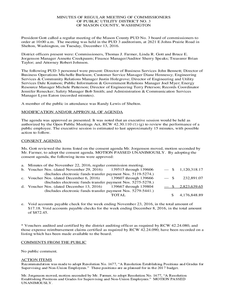 MINUTES OF REGULAR MEETING OF COMMISSIONERS OF PUBLIC UTILITY DISTRICT NO. 3 OF MASON COUNTY, WASHINGTONPresident Gott called a regular meeting of the Mason County PUD No. 3 board of commissioners