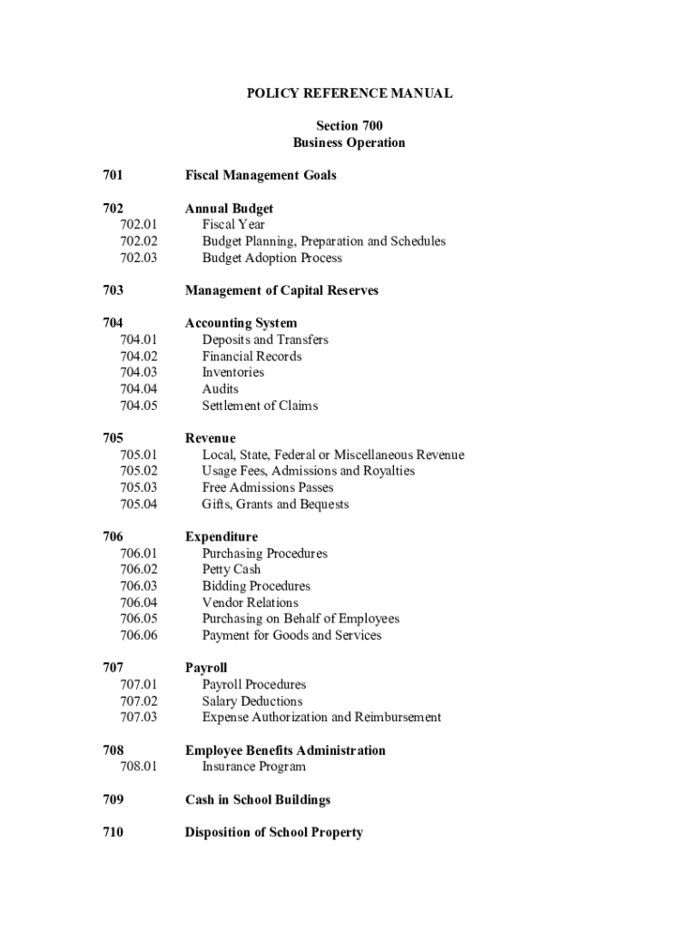 POLICY REFERENCE MANUAL Section 700 Business Operation 701Fiscal Management Goals702 702.01 702.02 702.03Annual Budget Fiscal Year Budget Planning, Preparation and Schedules Budget Adoption Process703Management