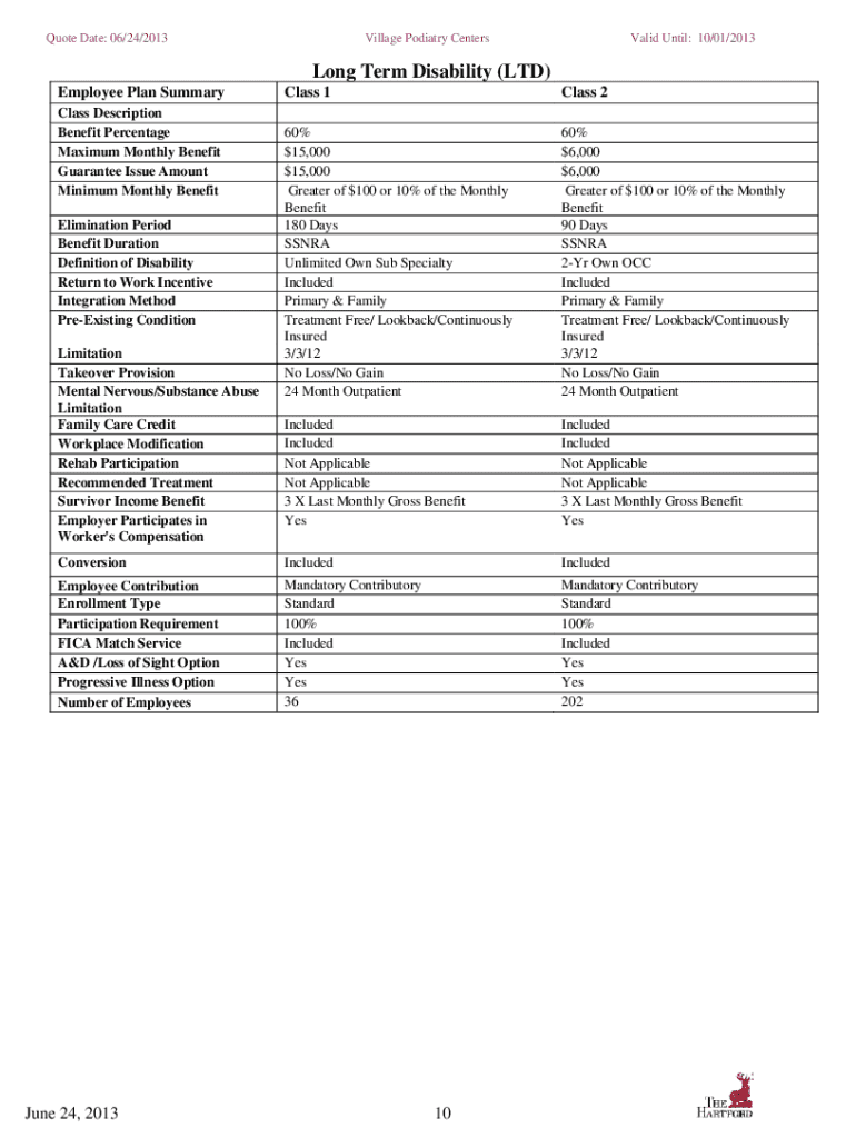 Quote Date: 06/24/2013Village Podiatry CentersValid Until: 10/01/2013Long Term Disability (LTD) Employee Plan SummaryClass 1Class 260% $15,000 $15,000 Greater of $100 or 10% of the Monthly Benefit