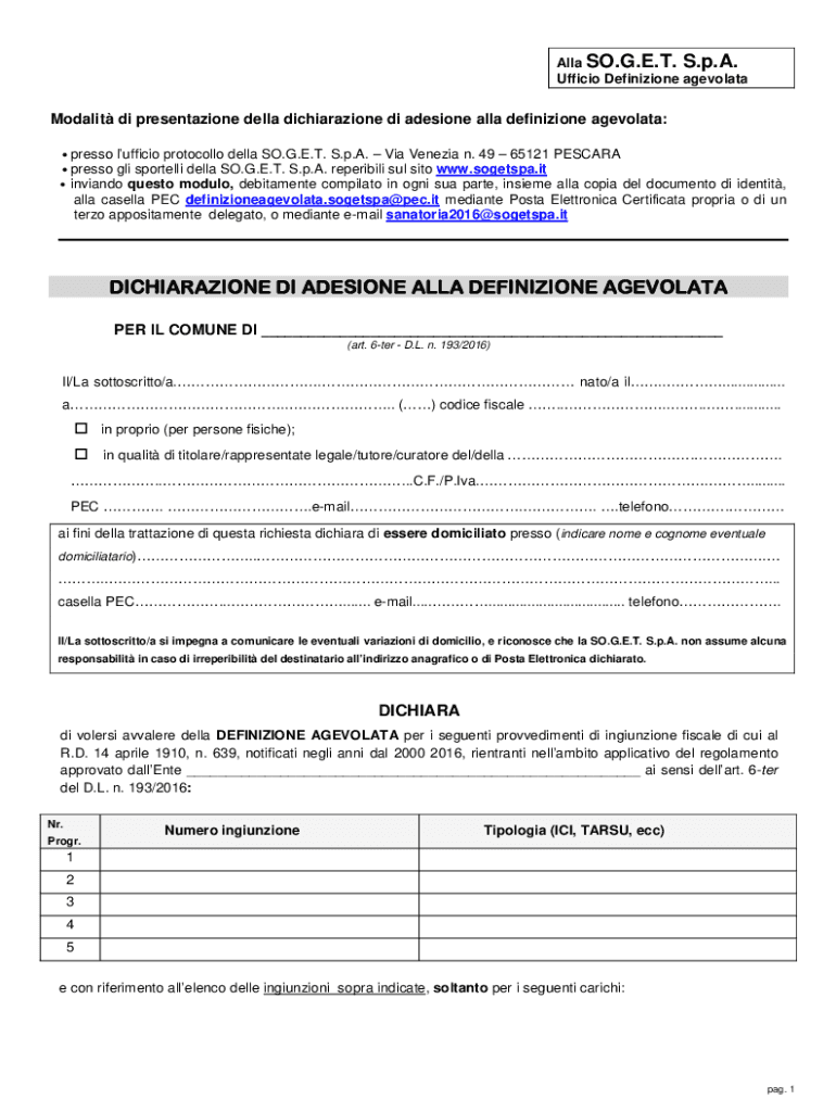 Alla SO.G.E.T. S.p.A. Ufficio Definizione agevolataModalit di presentazione della dichiarazione di adesione alla definizione agevolata: presso lufficio protocollo della SO.G.E.T. S.p.A. Via Venezia