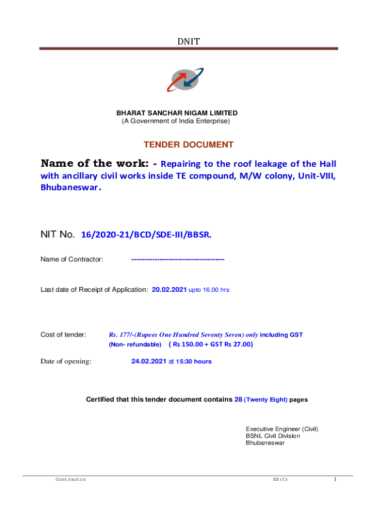 DNITBHARAT SANCHAR NIGAM LIMITED (A Government of India Enterprise)TENDER DOCUMENTName of the work: Repairing to the roof leakage of the Hall with ancillary civil works inside TE compound, M/W colony,