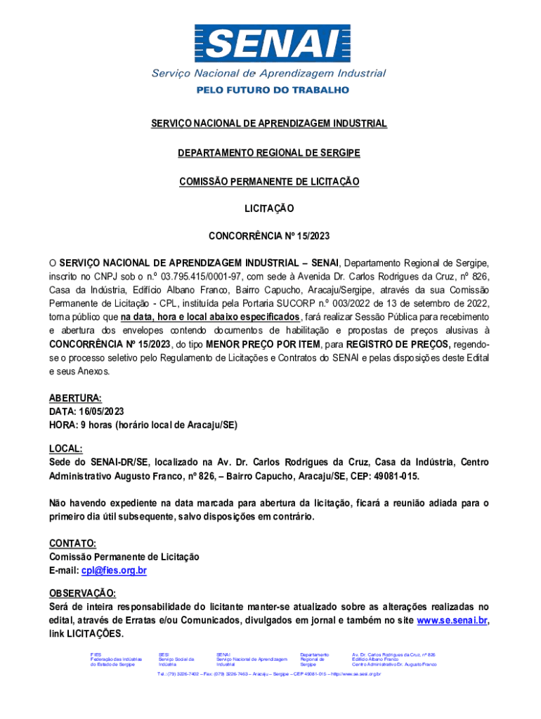SERVIO NACIONAL DE APRENDIZAGEM INDUSTRIAL DEPARTAMENTO REGIONAL DE SERGIPE COMISSO PERMANENTE DE LICITAO LICITAO CONCORRNCIA N 15/2023 O SERVIO NACIONAL DE APRENDIZAGEM INDUSTRIAL SENAI, Departamento