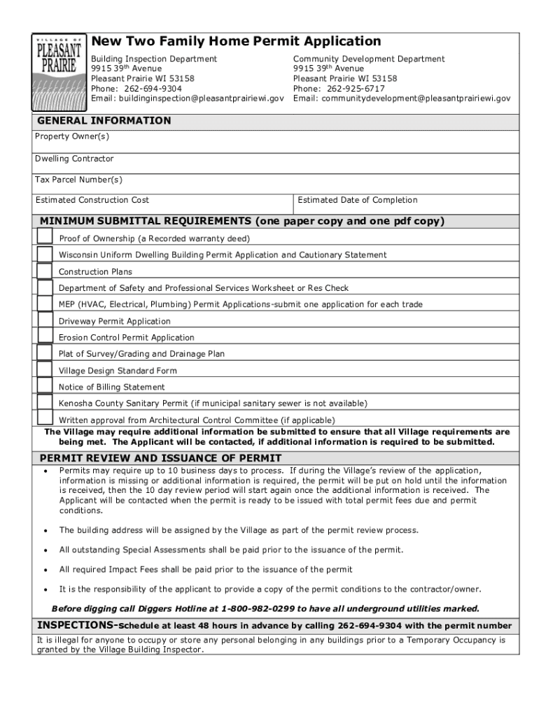 New Two Family Home Permit Application Building Inspection Department 9915 39th Avenue Pleasant Prairie WI 53158 Phone: 2626949304 Email: buildinginspection@pleasantprairiewi.govCommunity Development