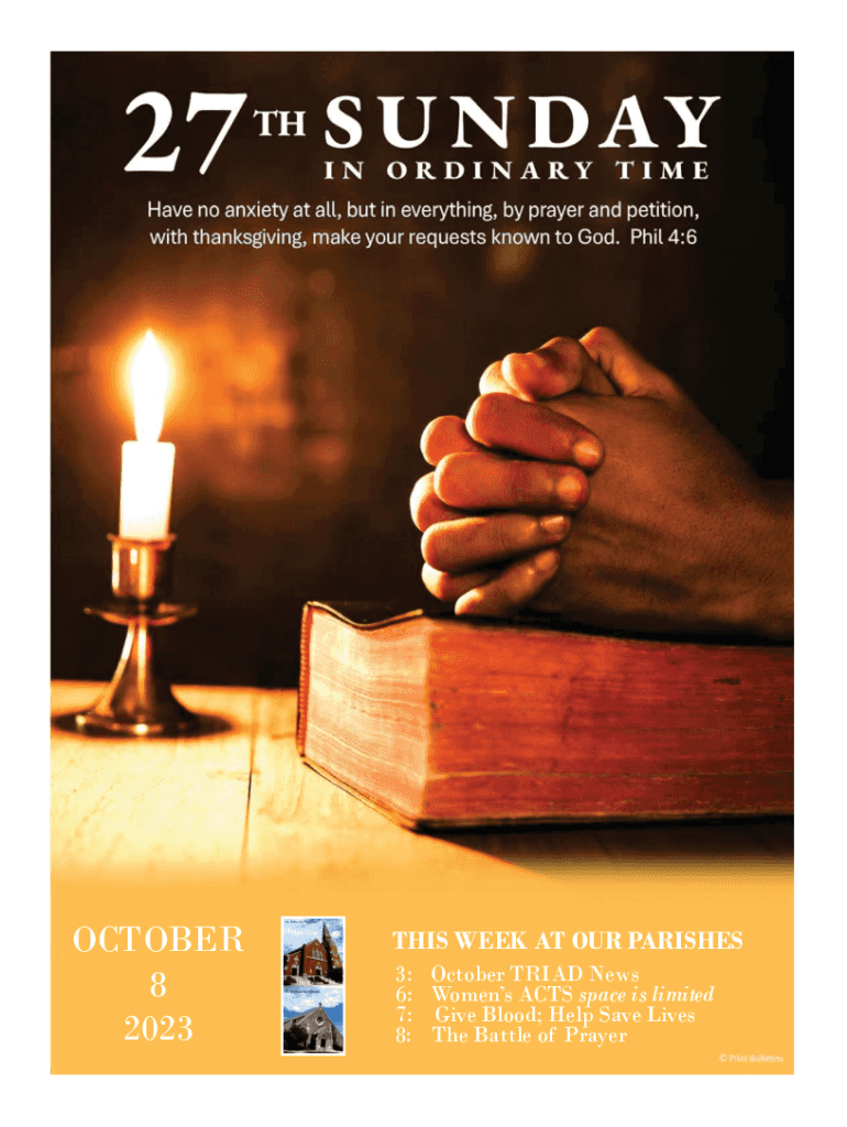 OCTOBER 8 2023THIS WEEK AT OUR PARISHES 3: 6: 7: 8:October TRIAD News Womens ACTS space is limited Give Blood; Help Save Lives The Battle of PrayerTwentyseventh Sunday in Ordinary TimeOctober 8, 2023WELCOMESt.