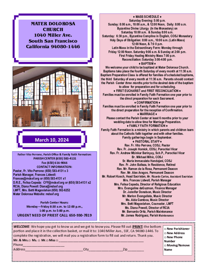 MATER DOLOROSA CHURCH 1040 Miller Ave. South San Francisco California 940801446March 10, 2024 Father Vito Perrone, Parish Oce & Family Faith Forma on:PARISH CENTER (650) 5834131 Fax (650) 6169066
