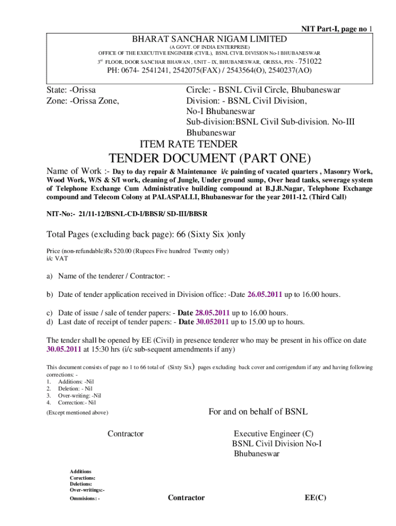 NIT PartI, page no 1BHARAT SANCHAR NIGAM LIMITED (A GOVT. OF INDIA ENTERPRISE) OFFICE OF THE EXECUTIVE ENGINEER (CIVIL), BSNL CIVIL DIVISION NoI BHUBANESWAR 3rd FLOOR, DOOR SANCHAR BHAWAN , UNIT IX,