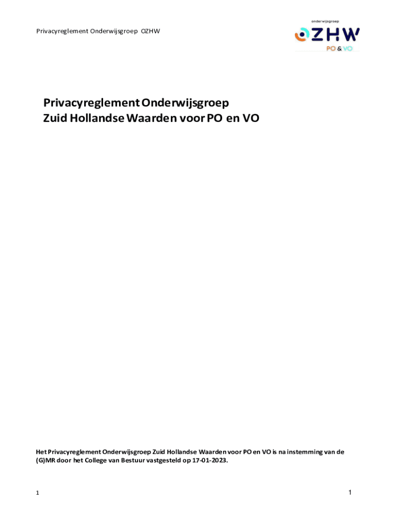 Privacyreglement Onderwijsgroep OZHWPrivacyreglement Onderwijsgroep Zuid Hollandse Waarden voor PO en VOHet Privacyreglement Onderwijsgroep Zuid Hollandse Waarden voor PO en VO is na instemming van