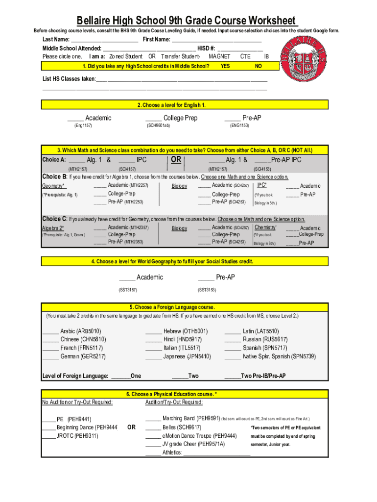 Bellaire High School 9th Grade Course WorksheetBefore choosing course levels, consult the BHS 9th Grade Couse Leveling Guide, if needed. Input course selection choices into the student Google form.Last