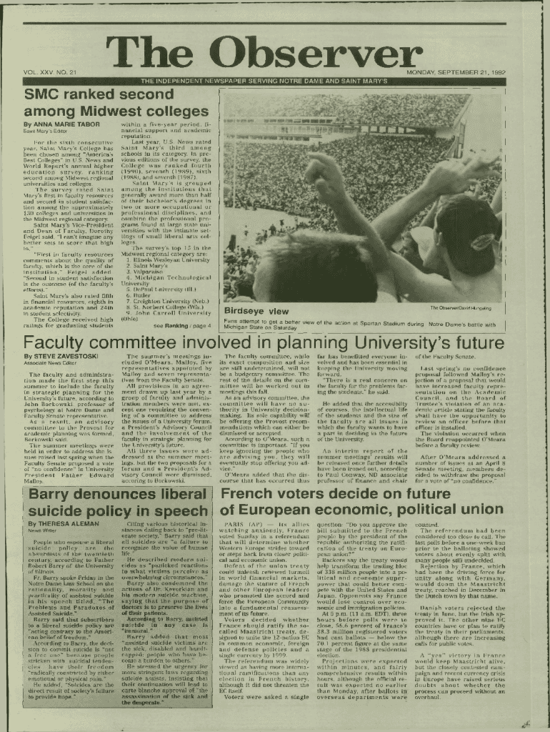 VOL. XXV. NO. 21The O bserver MONDAY, SEPTEMBER 21, 1992THE INDEPENDENT NEWSPAPER SERVING NOTRE DAME AND SAINT MARY\'SSMC ranked second among Midwest colleges By ANNA MARIE TABOR Saint Mary\'s EditorF
