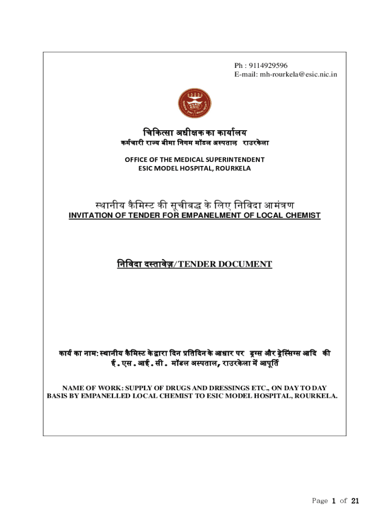 Ph : 9114929596 Email: mhrourkela@esic.nic.in , OFFICE OF THE MEDICAL SUPERINTENDENT ESIC MODEL HOSPITAL, ROURKELA INVITATION OF TENDER FOR EMPANELMENT OF LOCAL CHEMIST