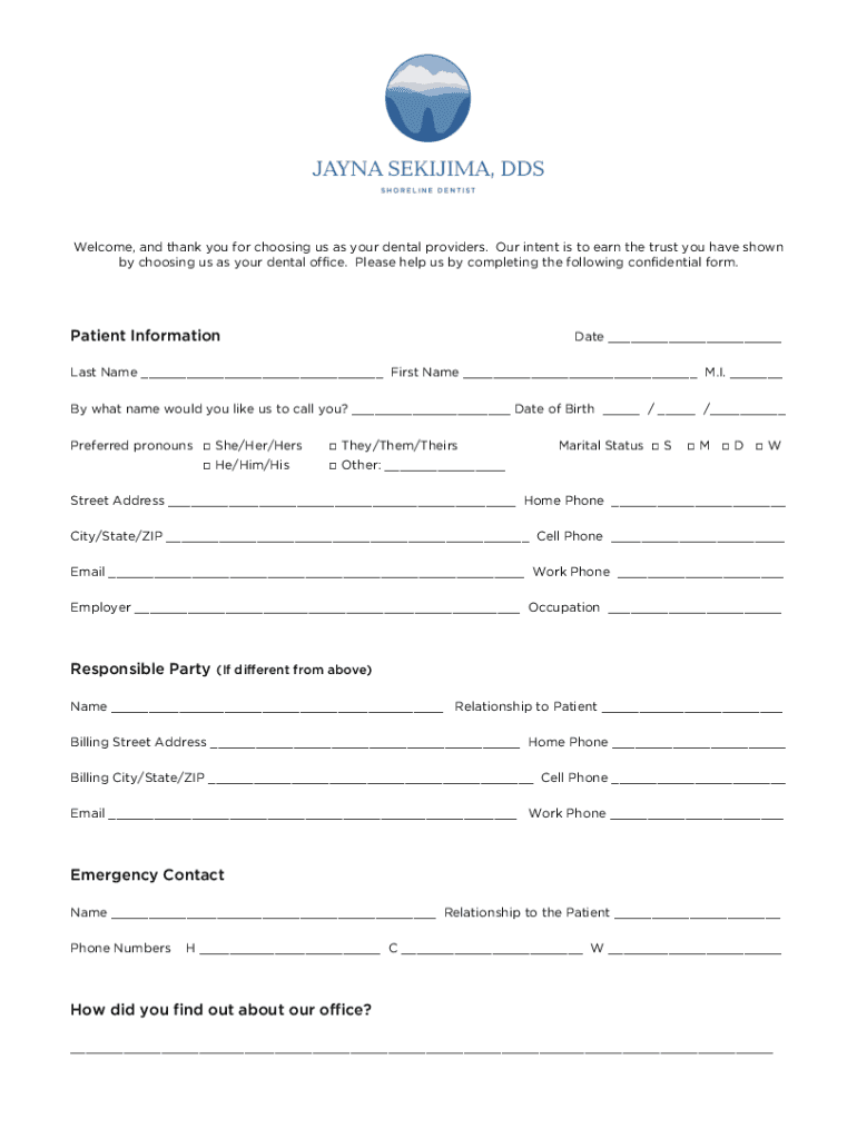 Welcome, and thank you for choosing us as your dental providers. Our intent is to earn the trust you have shown by choosing us as your dental office. Please help us by completing the following confidential