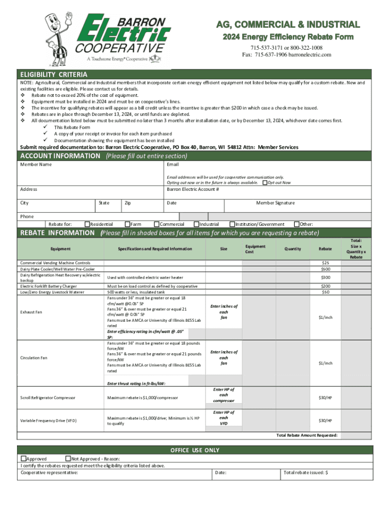 7155373171 or 8003221008 Fax: 7156371906 barronelectric.comELIGIBILITY CRITERIA NOTE: Agricultural, Commercial and Industrial members that incorporate certain energy efficient equipment not listed