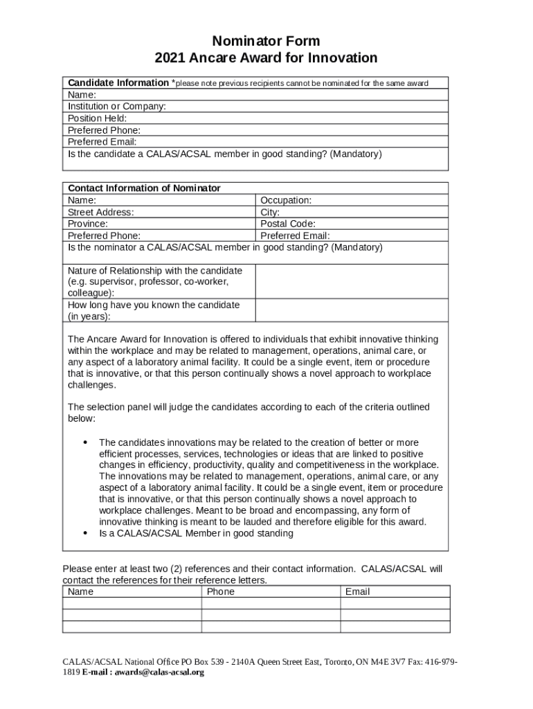 The Nominator 2020 Charles River Canada Award is a fillable form in MS Word extension that has to be completed and signed for specific purposes. In that case, it is provided to the actual addressee to provide specific info and data. The completion and signing is able or via a suitable application e. g. PDFfiller. Such tools help to send in any PDF or Word file without printing them out. While doing that, you can customize its appearance according to your requirements and put an official legal electronic signature. Upon finishing, the user sends the Nominator 2020 Charles River Canada Award to the recipient or several ones by email and also fax. PDFfiller is known for a feature and options that make your document of MS Word extension printable. It includes various options for printing out. It does no matter how you'll send a form - physically or electronically - it will always look neat and clear. In order not to create a new file from scratch over and over, make the original document into a template. Later, you will have a rewritable sample.