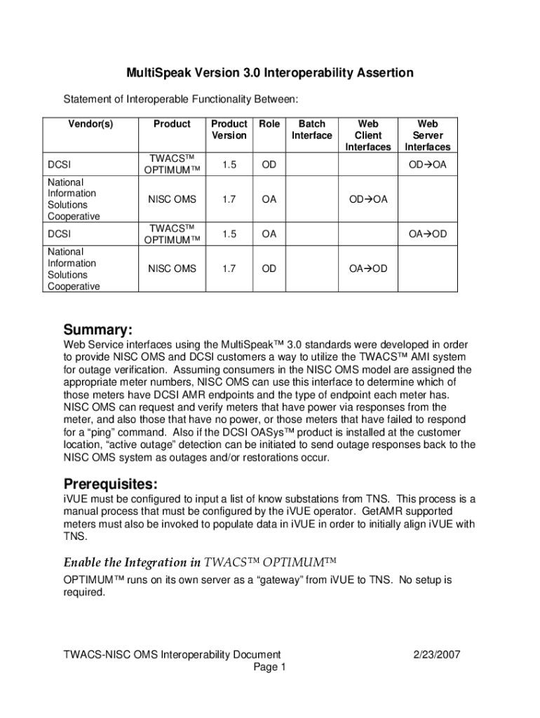 MultiSpeak Version 3.0 Interoperability Assertion Statement of Interoperable Functionality Between: Vendor(s)DCSI National Information Solutions Cooperative DCSI National Information Solutions CooperativeProductProduct