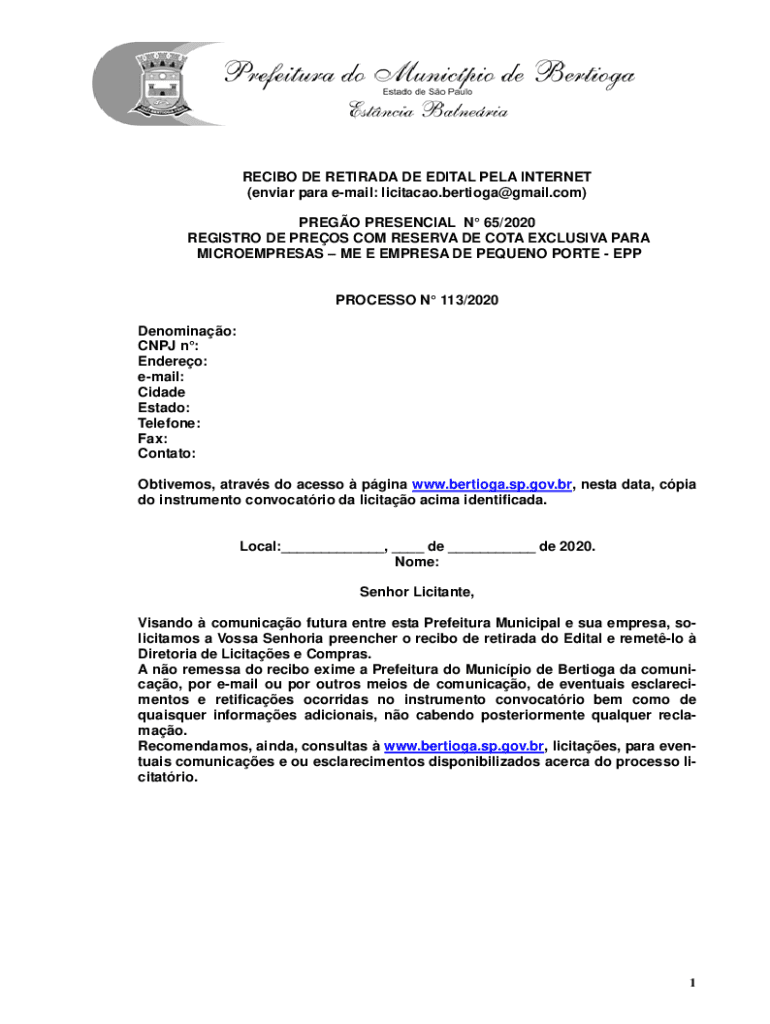 RECIBO DE RETIRADA DE EDITAL PELA INTERNET (enviar para email: licitacao.bertioga@gmail.com) PREGO PRESENCIAL N 65/2020 REGISTRO DE PREOS COM RESERVA DE COTA EXCLUSIVA PARA MICROEMPRESAS ME E EMPRESA