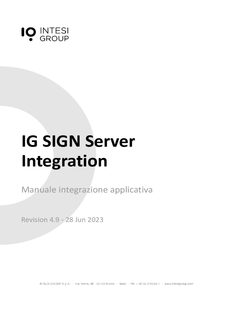 IG SIGN Server Integration Manuale integrazione applicativa Revision 4.9 28 Jun 2023IG SIGN Server Integration | rev. 4.9COPYRIGHT DISCLAIMER Tutti i Contenuti (testi, immagini, specifiche tecniche