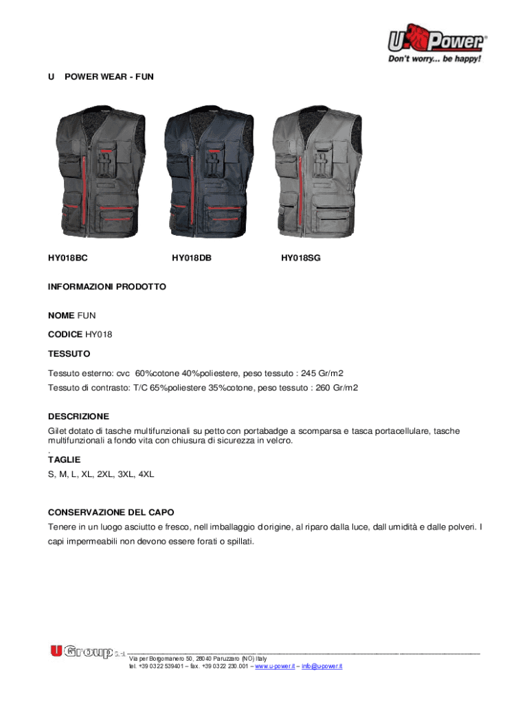 U POWER WEAR FUNHY018BCHY018DBHY018SGINFORMAZIONI PRODOTTONOME FUN CODICE HY018 TESSUTO Tessuto esterno: cvc 60%cotone 40%poliestere, peso tessuto : 245 Gr/m2 Tessuto di contrasto: T/C 65%poliestere