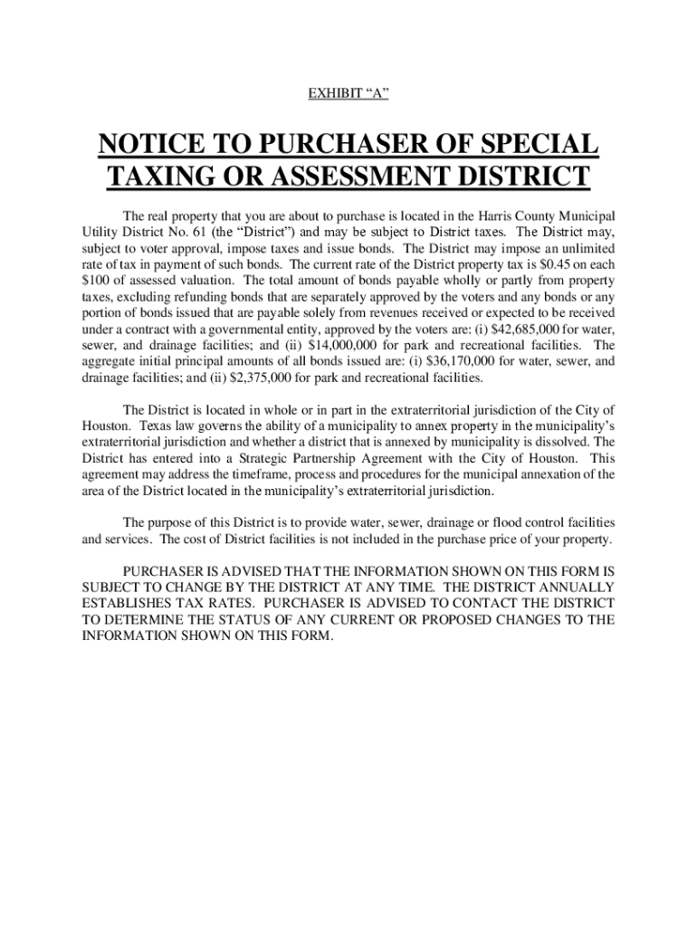 EXHIBIT ANOTICE TO PURCHASER OF SPECIAL TAXING OR ASSESSMENT DISTRICT The real property that you are about to purchase is located in the Harris County Municipal Utility District No. 61 (the District)