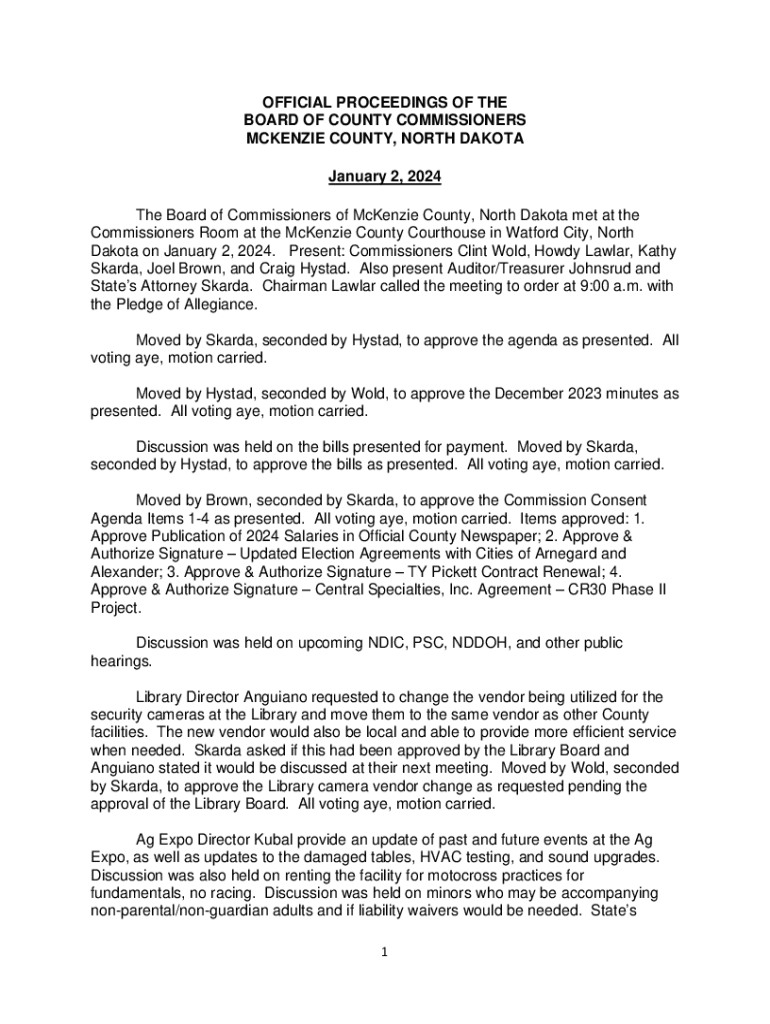 OFFICIAL PROCEEDINGS OF THE BOARD OF COUNTY COMMISSIONERS MCKENZIE COUNTY, NORTH DAKOTA January 2, 2024 The Board of Commissioners of McKenzie County, North Dakota met at the Commissioners Room at