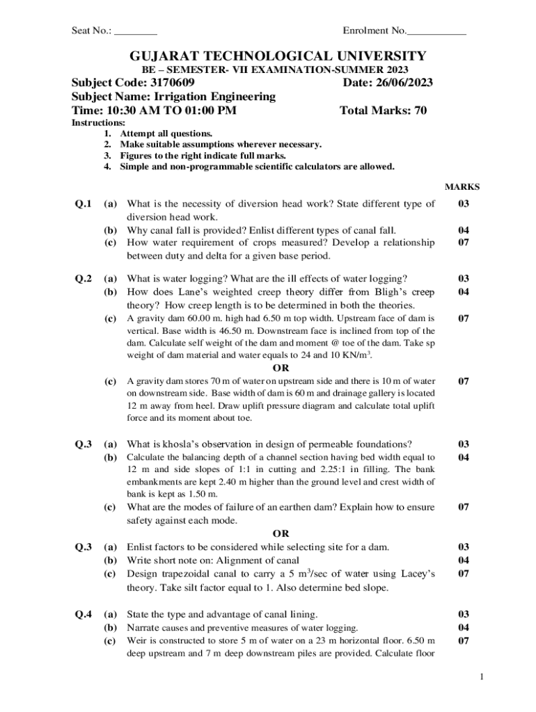 Seat No.: ___Enrolment No.___GUJARAT TECHNOLOGICAL UNIVERSITY BE SEMESTER VII EXAMINATIONSUMMER 2023Subject Code: 3170609 Subject Name: Irrigation Engineering Time: 10:30 AM TO 01:00 PMDate: 26/06/2023