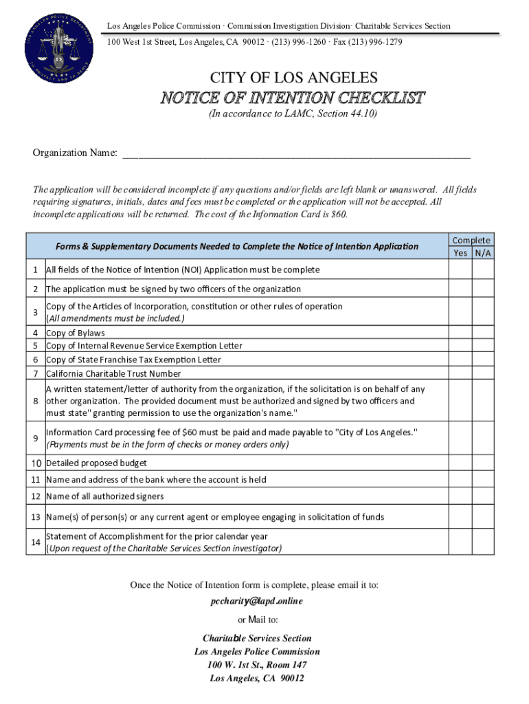 Los Angeles Police Commission Commission Investigation Division Charitable Services Section 100 West 1st Street, Los Angeles, CA 90012 (213) 9961260 Fax (213) 9961279CITY OF LOS ANGELESNOTICE OF INTENTION