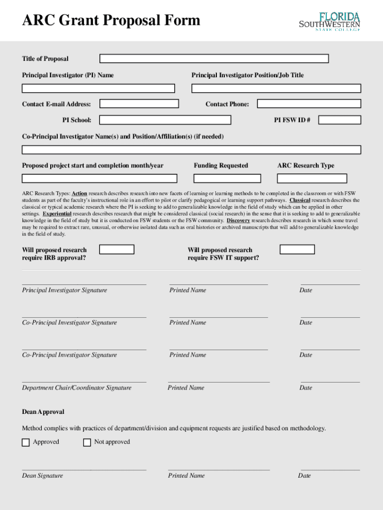 ARC Grant Proposal Form Title of Proposal Principal Investigator (PI) NameContact Email Address:Principal Investigator Position/Job TitleContact Phone:PI School:PI FSW ID #CoPrincipal Investigator