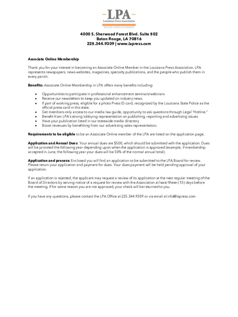 4000 S. Sherwood Forest Blvd. Suite 502 Baton Rouge, LA 70816 225.344.9309 | www.lapress.comAssociate Online Membership Thank you for your interest in becoming an Associate Online Member in the Louisiana