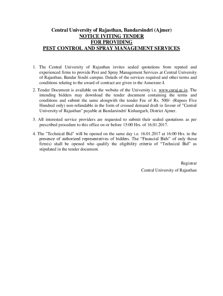 Central University of Rajasthan, Bandarsindri (Ajmer) NOTICE IVITING TENDER FOR PROVIDING PEST CONTROL AND SPRAY MANAGEMENT SERVICES1. The Central University of Rajasthan invites sealed quotations