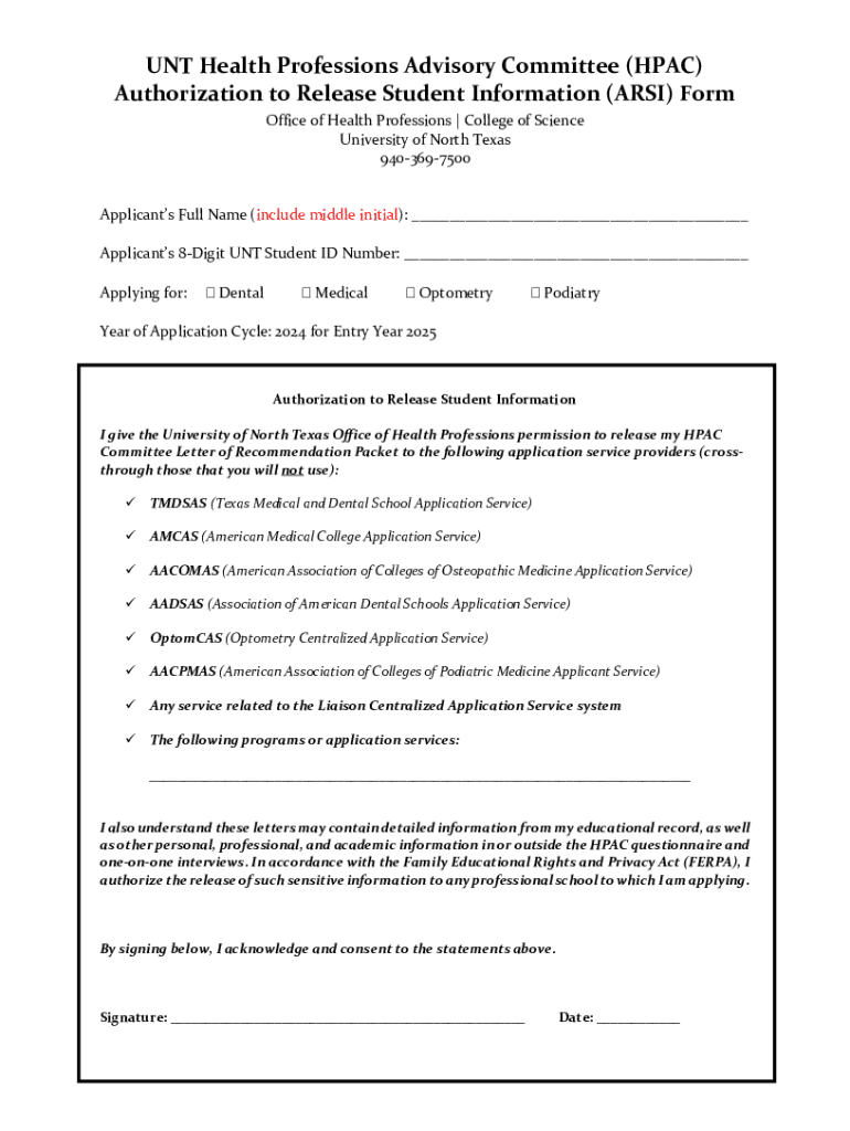 UNT Health Professions Advisory Committee (HPAC) Authorization to Release Student Information (ARSI) Form Office of Health Professions | College of Science University of North Texas 9403697500 Applicants