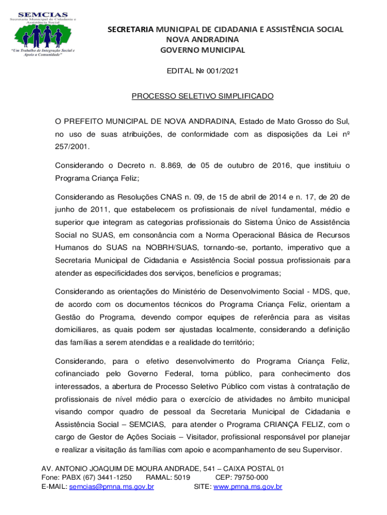 SECRETARIA MUNICIPAL DE CIDADANIA E ASSISTNCIA SOCIAL NOVA ANDRADINA GOVERNO MUNICIPAL EDITAL 001/2021PROCESSO SELETIVO SIMPLIFICADOO PREFEITO MUNICIPAL DE NOVA ANDRADINA, Estado de Mato Grosso do