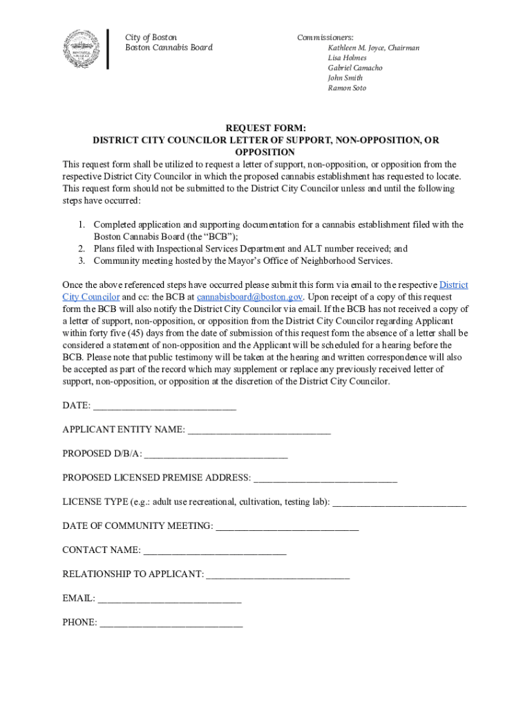 City of Boston Boston Cannabis BoardCommissioners: Kathleen M. Joyce, Chairman Lisa Holmes Gabriel Camacho John Smith Ramon Soto REQUEST FORM: DISTRICT CITY COUNCILOR LETTER OF SUPPORT, NONOPPOSITION,