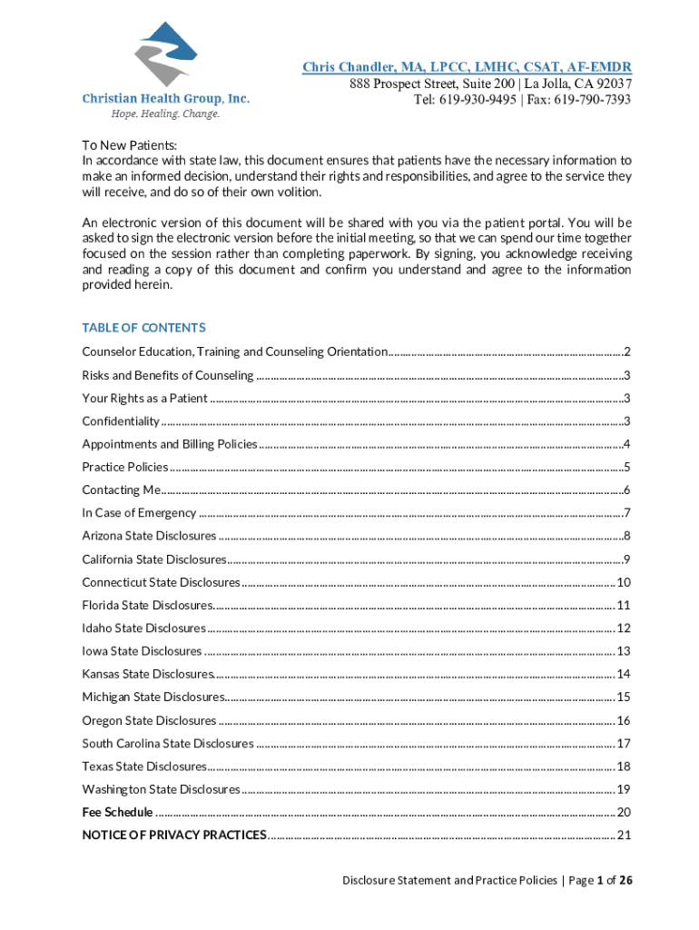 Chris Chandler, MA, LPCC, LMHC, CSAT, AFEMDR 888 Prospect Street, Suite 200 | La Jolla, CA 92037 Tel: 6199309495 | Fax: 6197907393 To New Patients: In accordance with state law, this document ensures