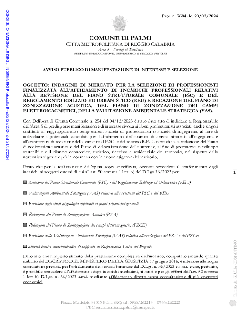 COMUNE DI PALMICITT METROPOLITANA DI REGGIO CALABRIA Area 5 Servizi al TerritorioSERVIZIO PIANIFICAZIONE, URBANISTICA E EDILIZIA PRIVATAAVVISO PUBBLICO DI MANIFESTAZIONE DI INTERESSE E SELEZIONEOGGETTO: