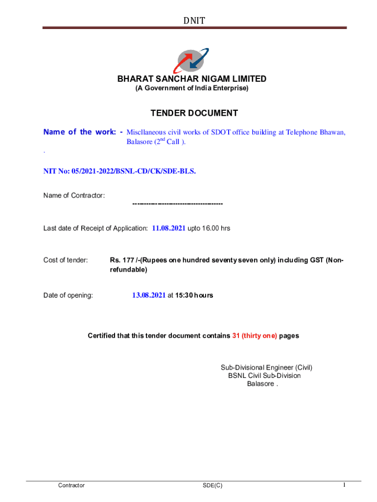 DNITBHARAT SANCHAR NIGAM LIMITED (A Government of India Enterprise)TENDER DOCUMENT Name of the work: Miscllaneous civil works of SDOT office building at Telephone Bhawan, Balasore (2nd Call ). . NIT