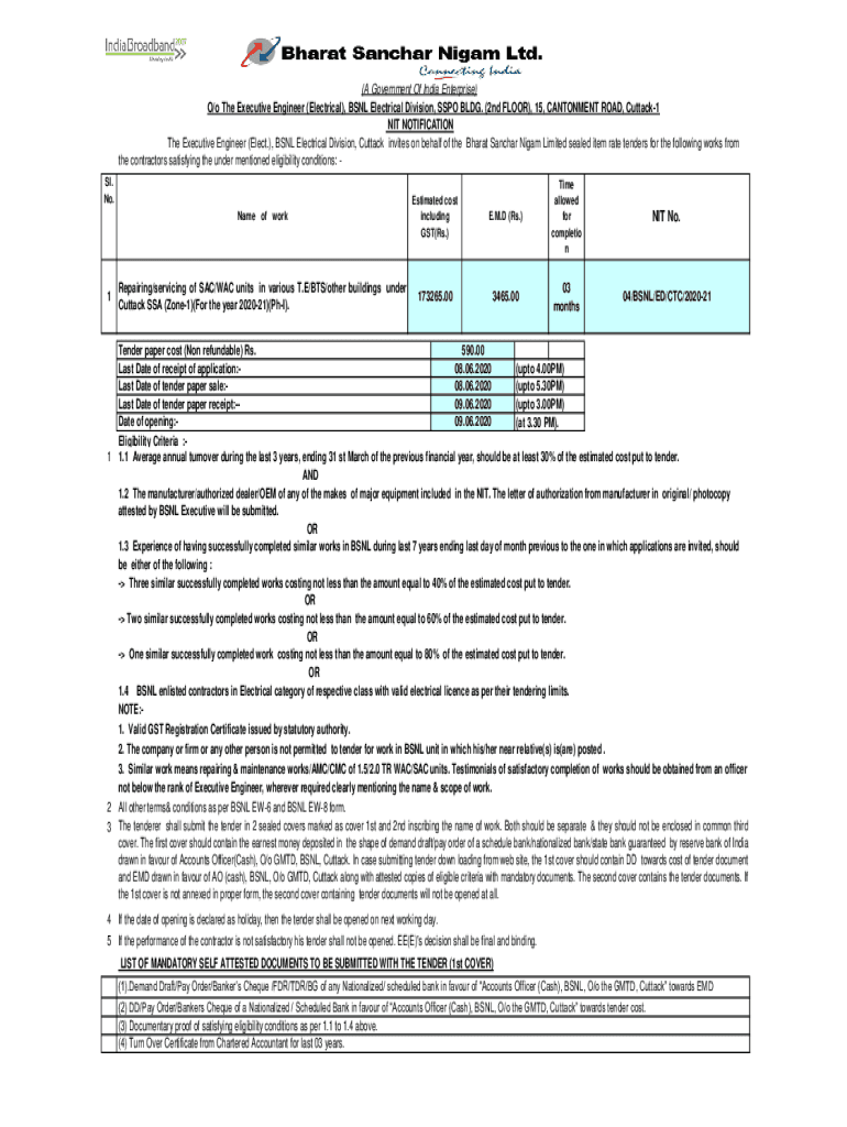 (A Government Of India Enterprise) O/o The Executive Engineer (Electrical), BSNL Electrical Division, SSPO BLDG. (2nd FLOOR), 15, CANTONMENT ROAD, Cuttack1 NIT NOTIFICATION The Executive Engineer